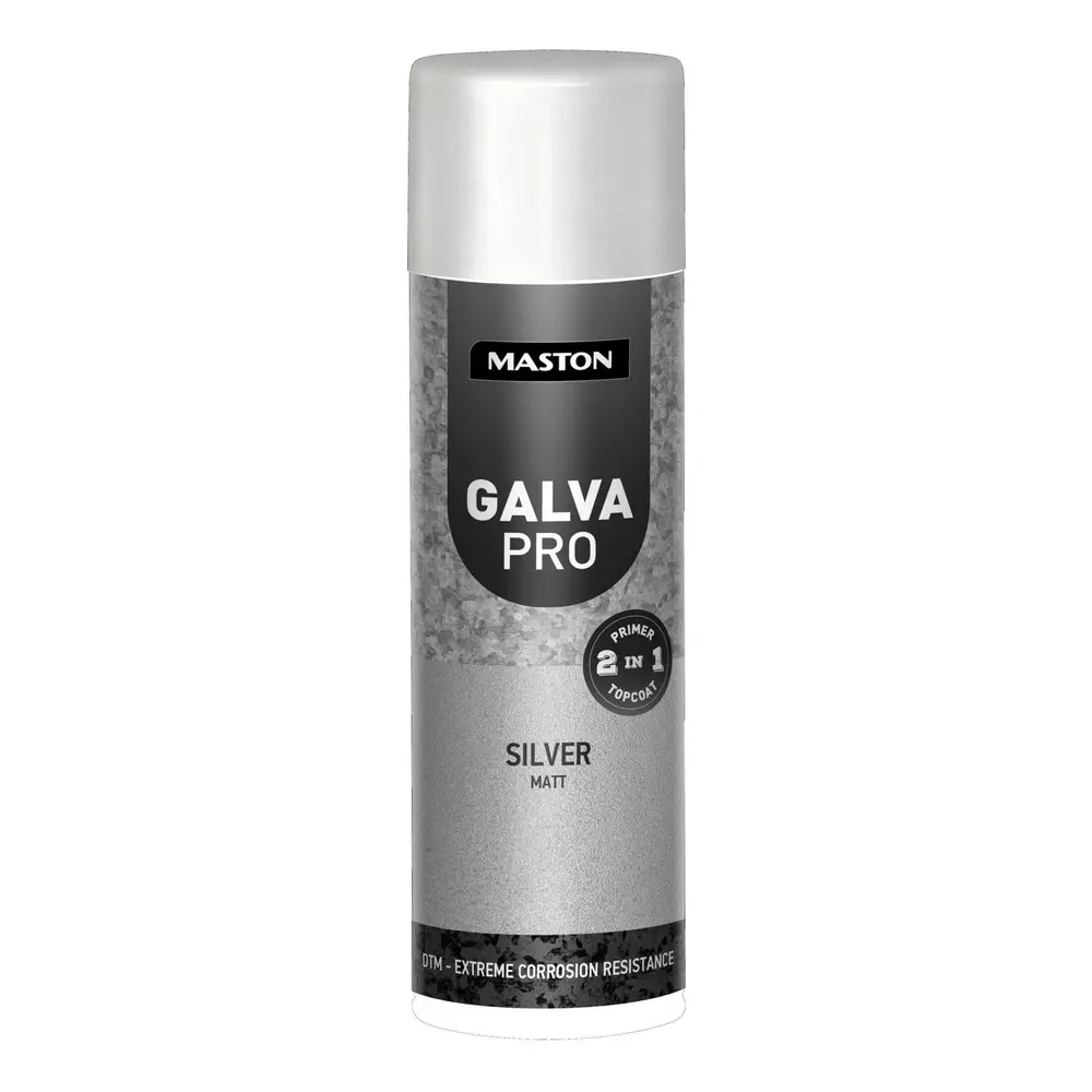 Maston Galva Pro on 2in1 spraymaali, joka toimii sekä pohjamaalina että pintamaalina. Maali soveltuu lähes kaikille metallipinnoille, kuten raudalle, alumiinille, ruostumattomalle teräkselle ja galvanoidulle teräkselle, sekä myös esimerkiksi puupinnoille. Maali antaa tasaisen mattapinnan ja tarjoaa erittäin tehokkaan suojan korroosiota vastaan.