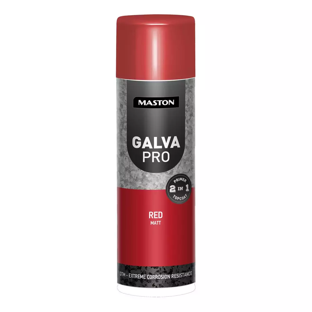 Maston Galva Pro on 2in1 spraymaali, joka toimii sekä pohjamaalina että pintamaalina. Maali soveltuu lähes kaikille metallipinnoille, kuten raudalle, alumiinille, ruostumattomalle teräkselle ja galvanoidulle teräkselle, sekä myös esimerkiksi puupinnoille. Maali antaa tasaisen mattapinnan ja tarjoaa erittäin tehokkaan suojan korroosiota vastaan.