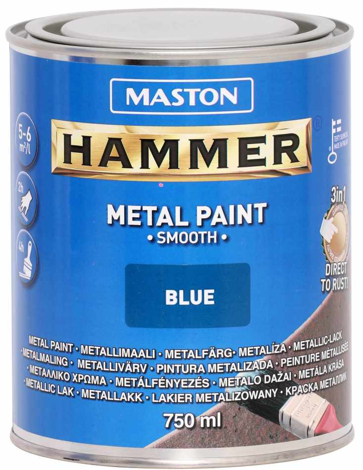 Maston HAMMER SMOOTH (sileä) METALLIMAALI jossa ruosteenesto-, pohjamaali- ja pintamaali yhdessä muodostaa lujan, kiiltävän pinnan kaikille metallipinnoille.