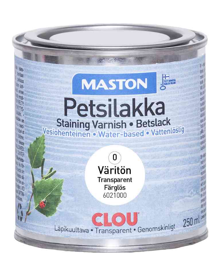 Maston WOODmix Vesiohenteinen CLOU Petsilakka. Käsittelemättömien ja aiemmin käsiteltyjen puupintojen käsittelyyn ja uusimiseen. Läpikuultava, valonkestävä pinta. Soveltuu myös lasten leluille. Täyttää normien DIN 68861-1C ja EN71-3 vaatimukset. VAIN SISÄKÄYTTÖÖN. Geelimäinen.