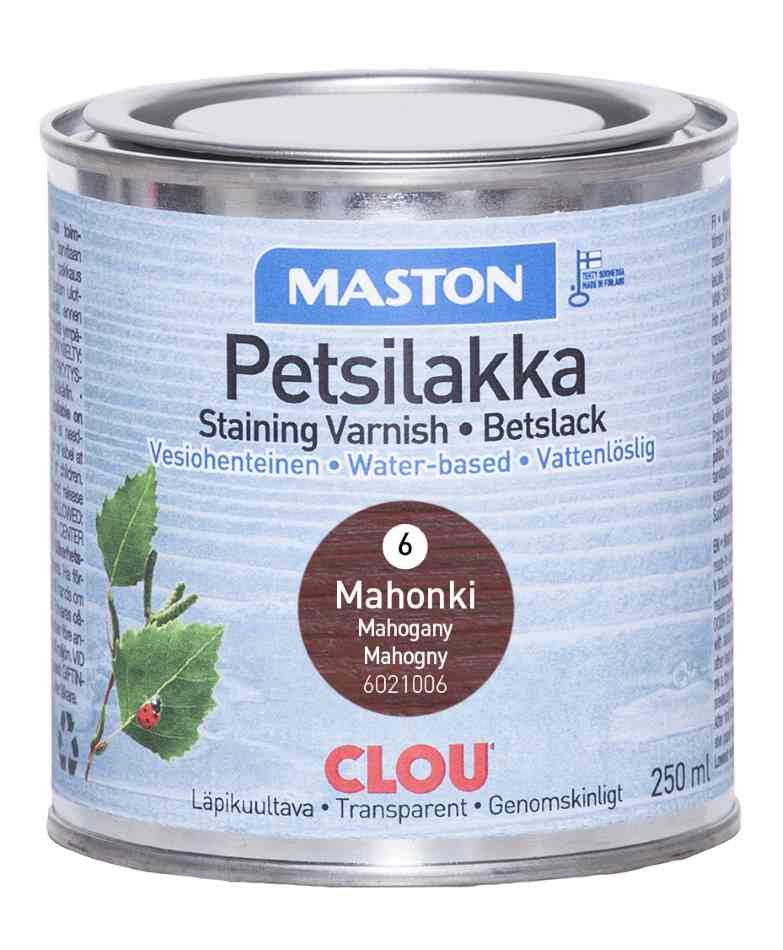 Maston WOODmix Vesiohenteinen CLOU Petsilakka. Käsittelemättömien ja aiemmin käsiteltyjen puupintojen käsittelyyn ja uusimiseen. Läpikuultava, valonkestävä pinta. Soveltuu myös lasten leluille. Täyttää normien DIN 68861-1C ja EN71-3 vaatimukset. VAIN SISÄKÄYTTÖÖN. Geelimäinen.