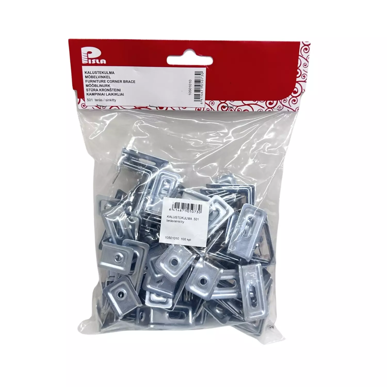 Tukeva ja monikäyttöinen Pisla 501 -kalustekulma sopii erinomaisesti kalusteiden kulmaliitoksiin ja rakenteiden vahvistamiseen. Kulmalevyn avulla voit helposti kiinnittää esimerkiksi hyllyn tai kaapin seinään tai varmistaa kulmaliitoksen kestävyyden. Sinkitty teräs kestää hyvin kulutusta ja kosteutta, mikä tekee tuotteesta pitkäikäisen ja luotettavan. Kalustekulma on kätevä apuväline niin kodin nikkarointiin kuin ammattikäyttöön. Pakkauksessa 100 kpl.