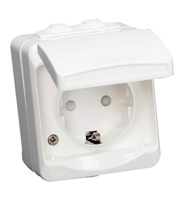 Roiskevesisuojattu pinta-asennettava 1-osainen maadoitettu pistorasia.