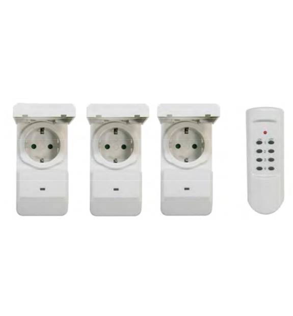 Pakkaus sisältää 3 pistorasiaa, kaukosäätimen sekä pariston kaukosäätimeen.