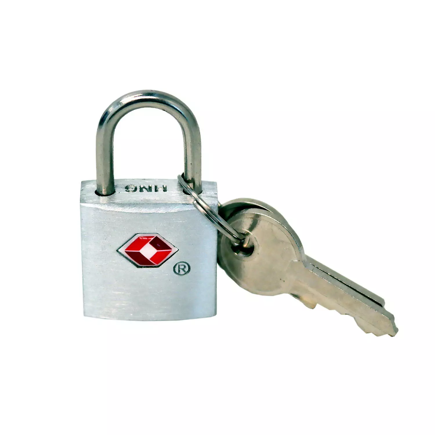 Perinteinen matkailuun soveltuva kestävä riippulukko TSA-hyväksynnällä. Alumiinirunko.