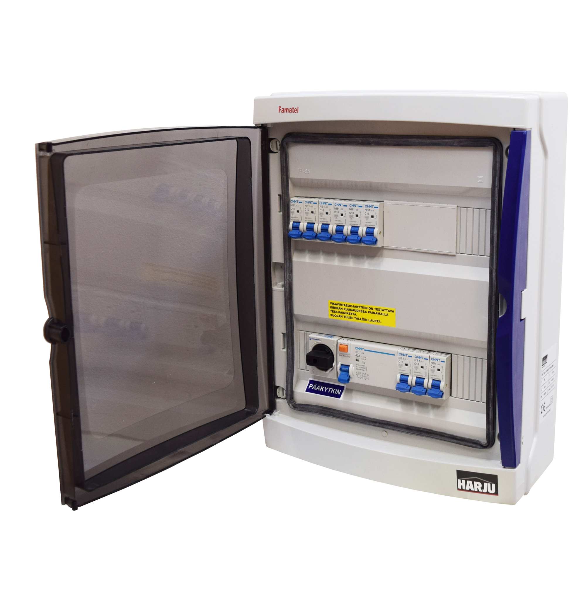 vikavirtasuojakytkin 4-napainen 40A/30 mA, jonka takana 3 kpl johdonsuojakatkaisijoita C16 A