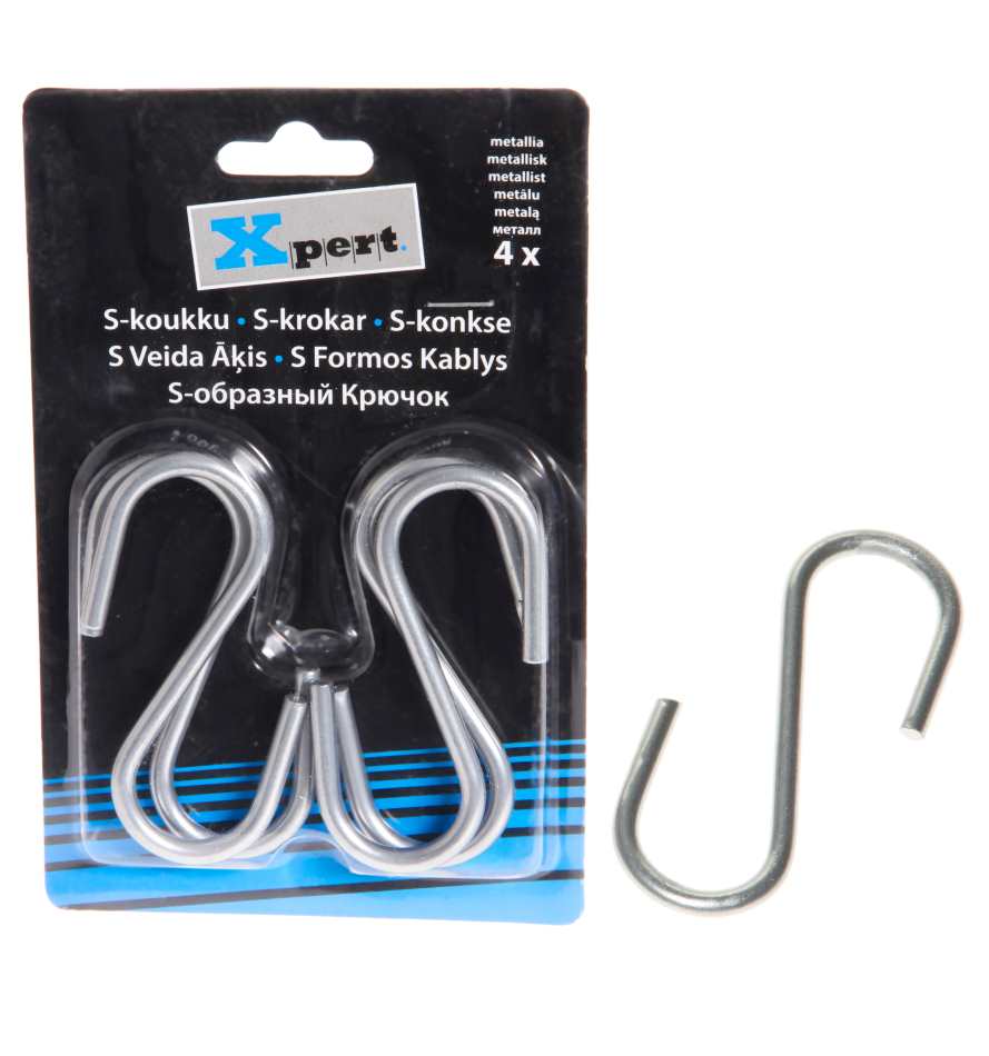 Pakkauksessa 4kpl metallisia hopean värisiä S-koukkuja erilaisiin ripustuksiin.