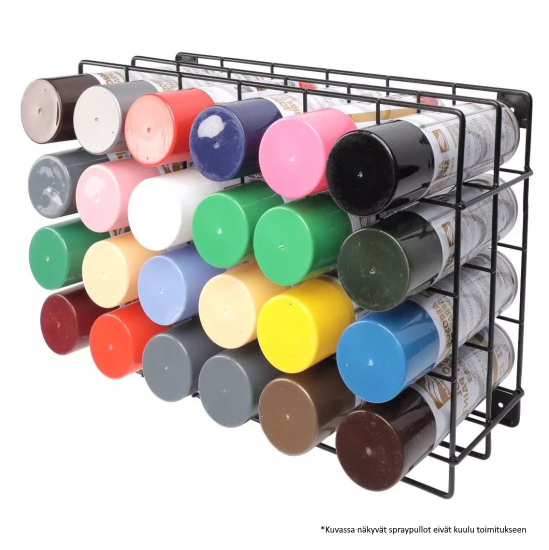 Kätevä teline spraymaaleille ja muille painepulloille. Kiinnitä teline seinään ruuveilla ja aseta pullot telineeseen säilytettäväksi. Toimii hyvin myös vaakaan asennettuna esim. työkaluvaunun päällä.