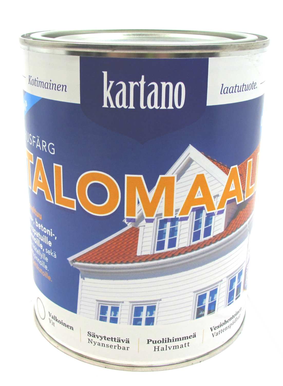 Kotimainen, Suomessa valmistettu laadukas vesiohenteinen talomaali hyvillä peitto-ominaisuuksilla.