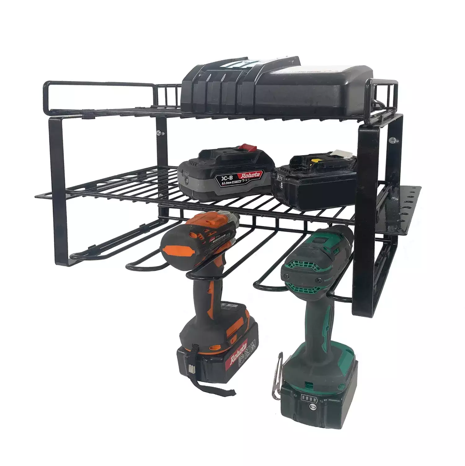 Alimmalle tasolle saat ripustettua porakoneet näppärästi kahvasta ja kaksi ylempää hyllyä sopivat hyvin akkujen, latureiden tai muiden pientyökalujen säilyttämiseen. Akkuporakonehylly kiinnitetään seinään neljällä ruuvilla.