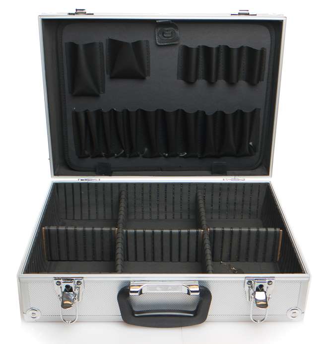 Vahva alumiininen salkku, jonka sisällä monipuoliset kiinnike- lajittelumahdollisuudet sekä riittävät pehmikkeet.