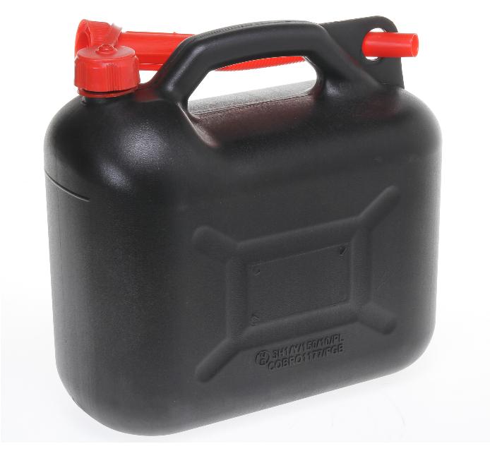 Musta Varakanisteri polttoaineille ja muille nesteille. Mukana kierrettävä, taipuisa kaatonokka.