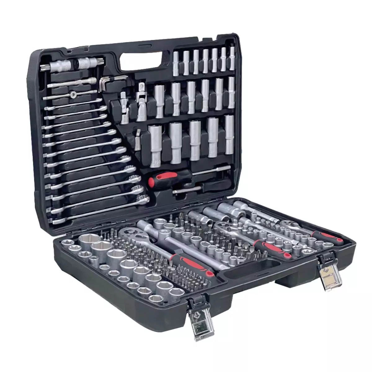 Iso hylsysarja sisältää muun muassa kolme erikokoista räikkäväännintä (1/4", 3/8" ja 1/2"), 12 kiintoavainta (8–22 mm), useita jatkovarsia ja niveliä sekä erilaisia sytytystulppahylsyjä. Yleisimmät hylsykoot ja kärjet takaavat, että työkalut soveltuvat autojen, pienkoneiden ja muiden laitteiden huoltoihin ja korjauksiin. Selkeästi järjestetty muovikotelo pitää hylsyt ja osat omilla paikoillaan ja tekee oikeankokoisen työkalun löytämisestä nopeaa.