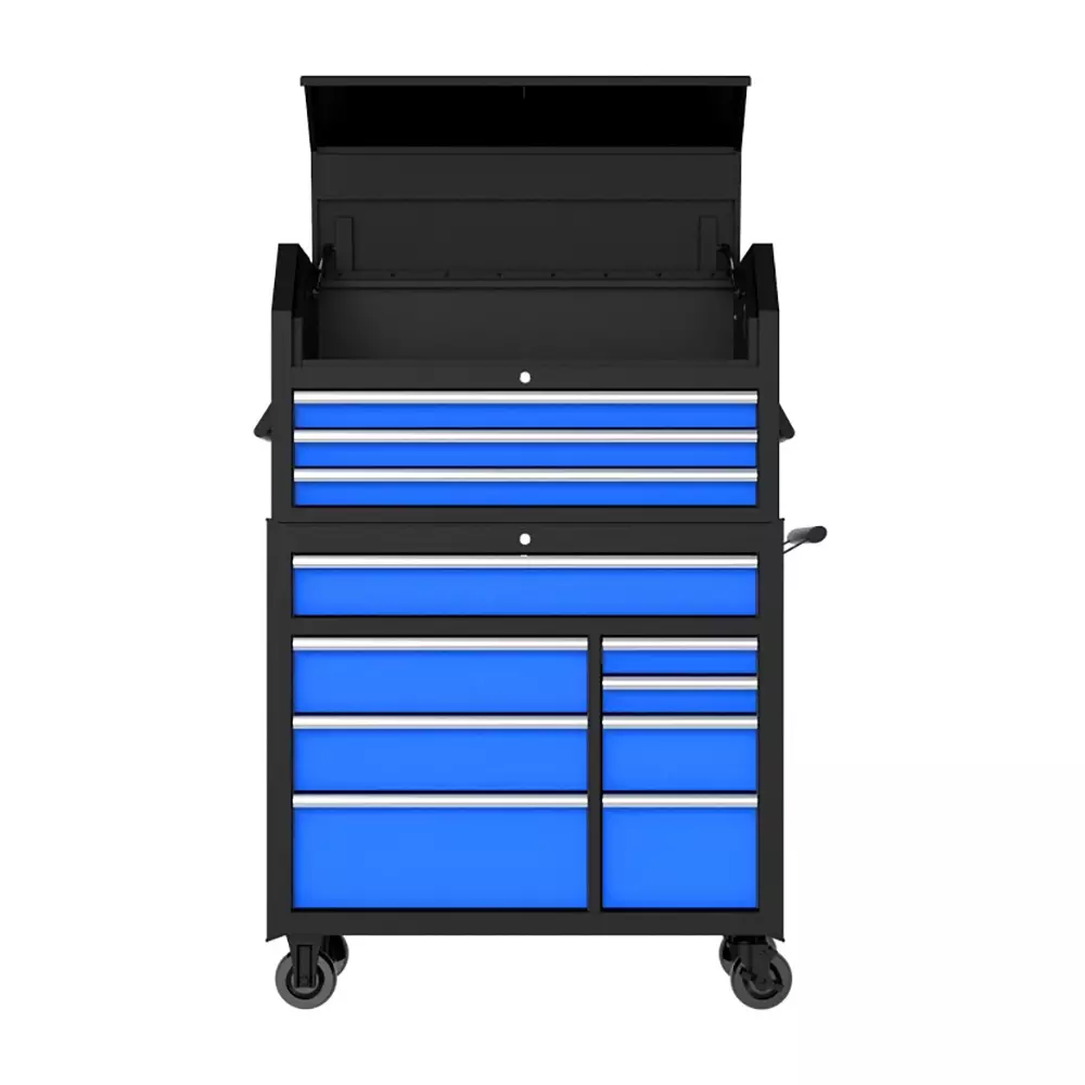 Tämä isokoinen ja kaksiosainen työkaluvaunu tarjoaa runsaasti säilytystilaa työkaluille ja tarvikkeille, ja se sopii erinomaisesti niin autotalliin, korjaamolle kuin ammattilaisen verstaskäyttöön. Vaunussa on yläosa nostokannella ja kolme matalaa vetolaatikkoa sekä alayksikkö, jossa kahdeksan erikokoista laatikkoa. Yhteensä siis 11 vetolaatikkoa, jotka auttavat pitämään työkalut hyvässä järjestyksessä ja helposti saatavilla.