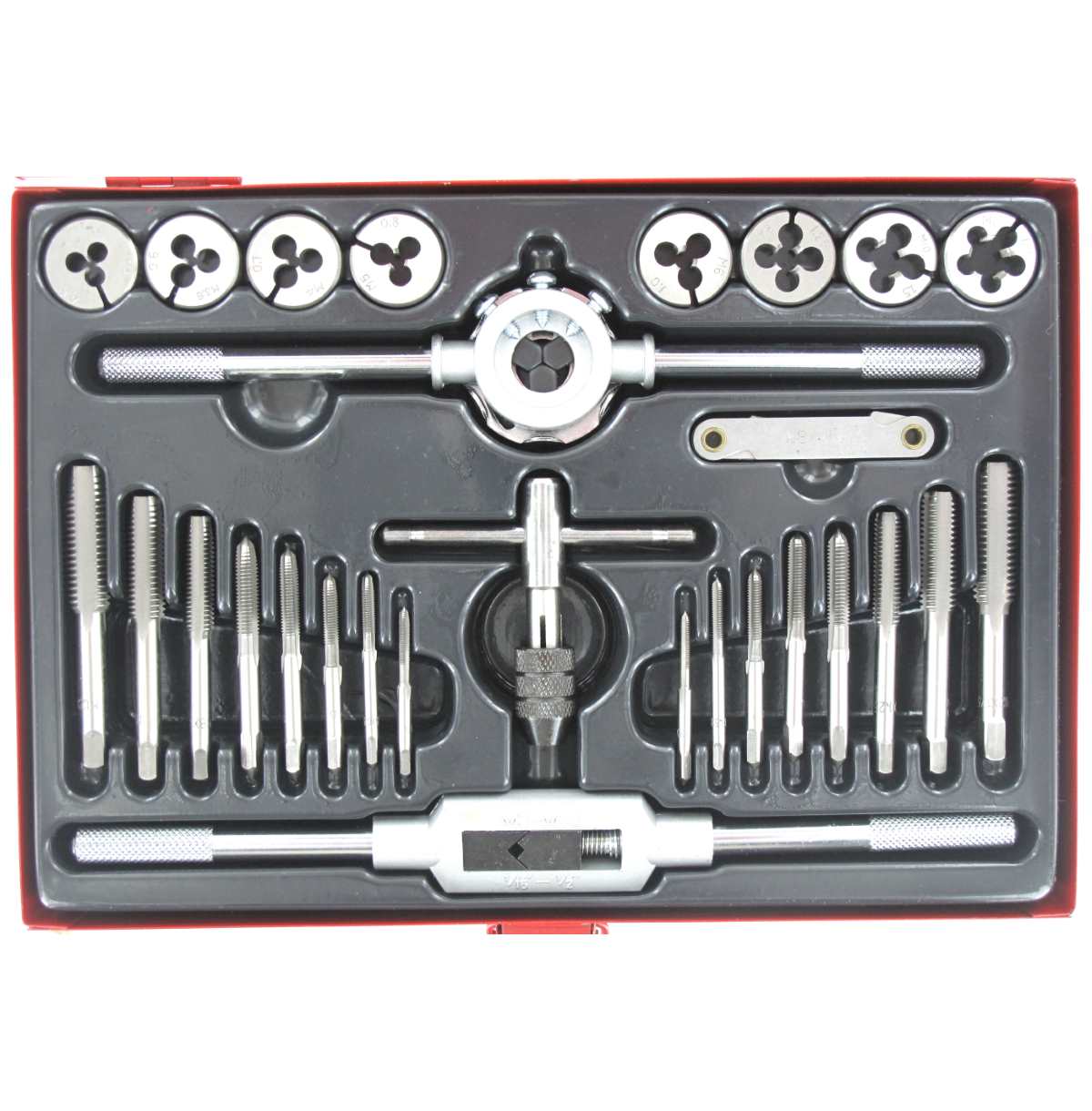 Kattava ja kestävä kierretappi-/kierrepakkasarja kestävässä peltilaatikossa.