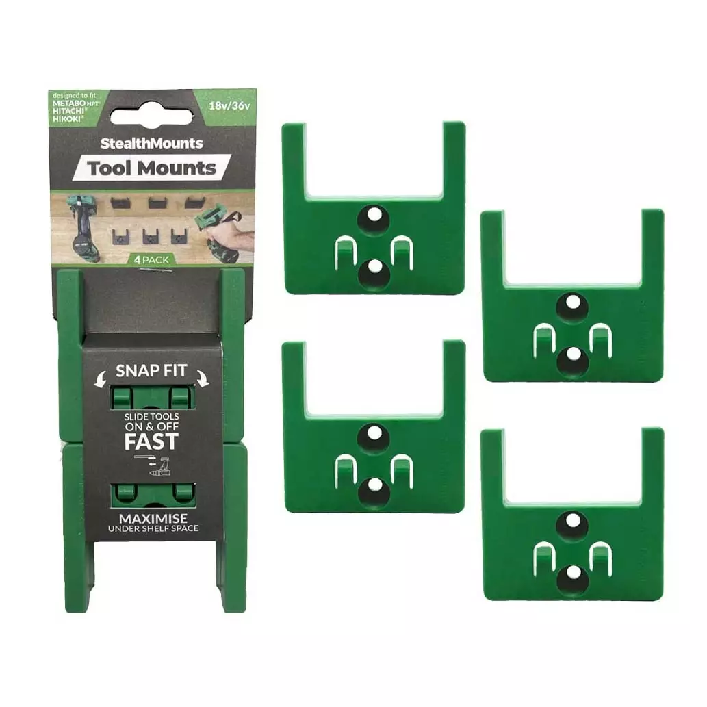StealthMounts työkalupidikkeet, jotka on suunniteltu HiKOKI, Metabo HPT ja Hitachi 18V akkutyökalujen säilyttämiseen. Pidä koneet siististi järjestyksessä ja helposti saatavilla esimerkiksi työpisteellä, verstaassa tai pakettiauton kyljessä. Koneenpidike toimii tutulla Snap Fit -kiinnityksellä eli kone napsahtaa selkeästi paikoilleen ja irtoaa helposti vetämällä ulos.