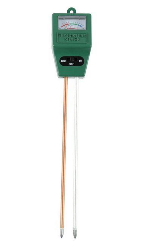 Mittari maaperän kosteuden ja PH-arvojen mittaamiseen. Väri-indikaattori optiomaaliselle kosteus- ja PH-alueelle.