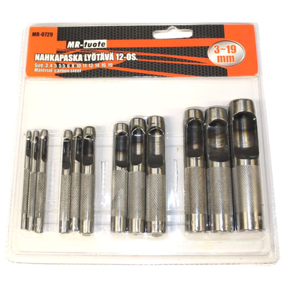 Pakkaus sisältää 12kpl eri kokoisia lyötäviä nahan lävistimiä, eli nahkapaskoja. Valmistettu kestävästä hiiliteräksestä. Mukana koot: Koot: 3, 4, 5, 5.5, 6, 8, 10, 11, 13, 14, 16 ja 19 mm
