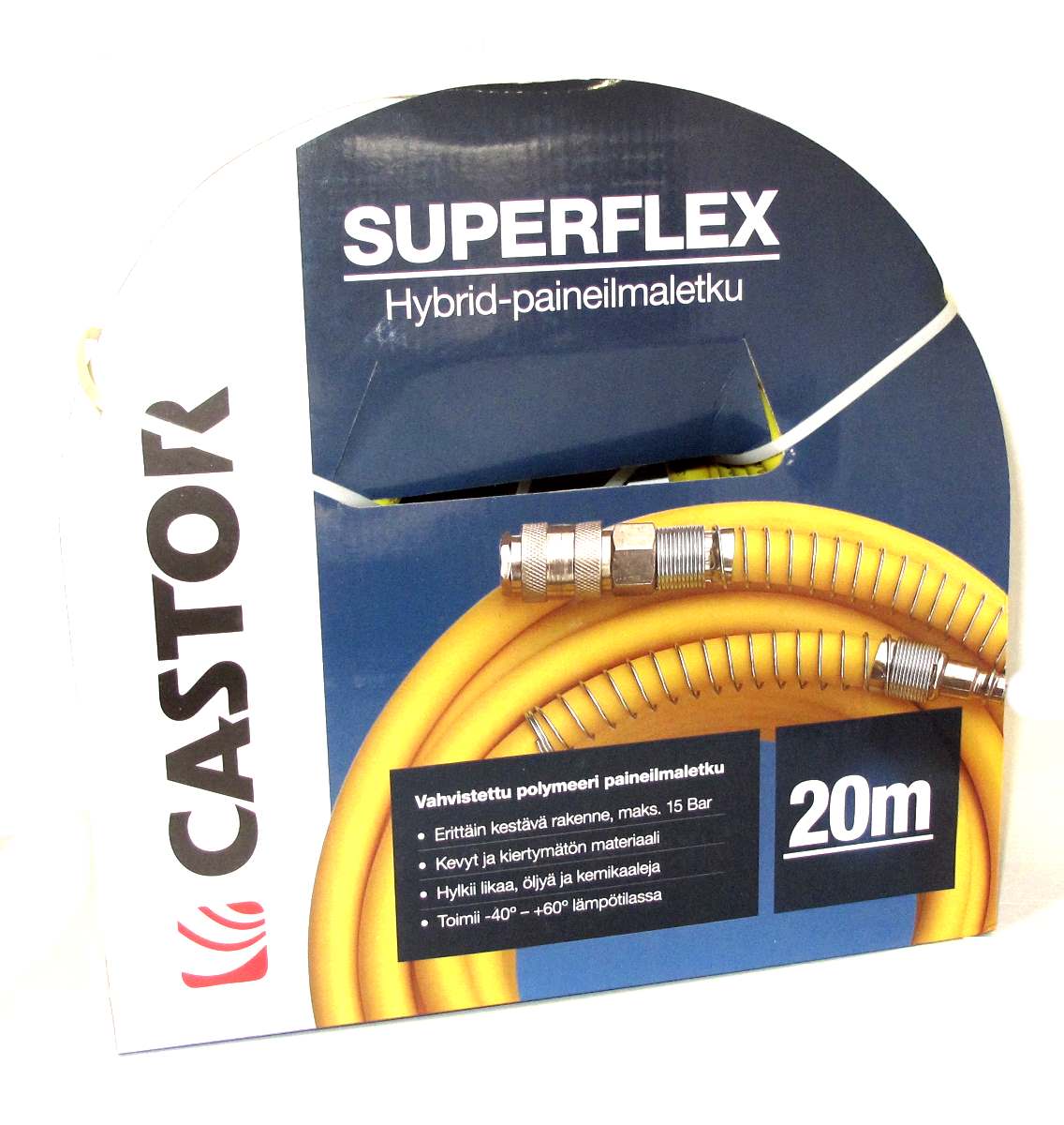 Kestävä ja taipuisa Castor Superflex -paineilmaletku soveltuu erinomaisesti monipuoliseen käyttöön niin ammattilaisille kuin harrastajille. Letku pysyy pehmeänä myös pakkasessa, joten se toimii luotettavasti ympärivuotisesti vaativissakin olosuhteissa. Kevyt ja kiertymätön rakenne tekee letkusta helpon käsitellä, ja se hylkii likaa, öljyä ja kemikaaleja, mikä lisää käyttöikää ja varmuutta.
