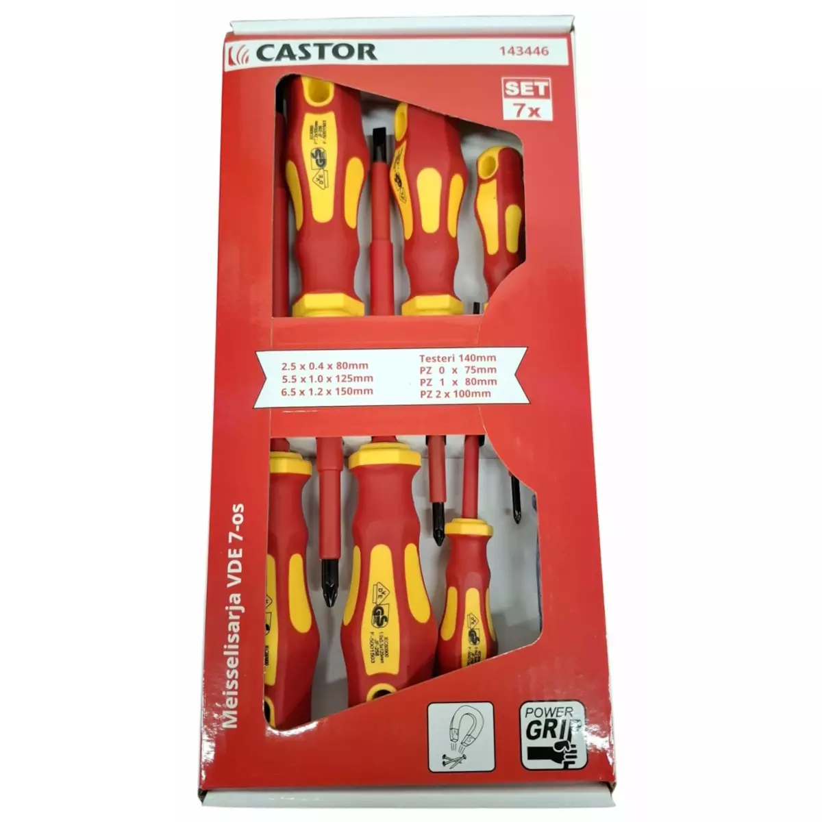 Monipuolinen 7-osainen VDE-ruuvimeisselisarja sähköasennuksiin ja ammattilaiskäyttöön. Sarjan meisselit on testattu 1000 V jännitteelle, joten ne soveltuvat turvalliseen työskentelyyn sähköä johtavien kohteiden parissa. Mukana kätevä säilytyskotelo, joka pitää työkalut järjestyksessä ja helposti saatavilla.