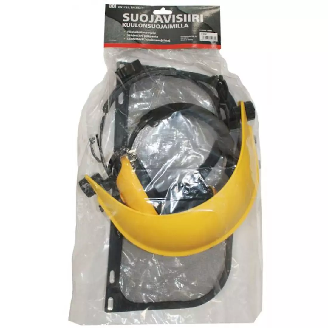 Päälaki- kuulonsuojain ja visiiri verkolla. Ylöstaitettava visiiri verkolla.