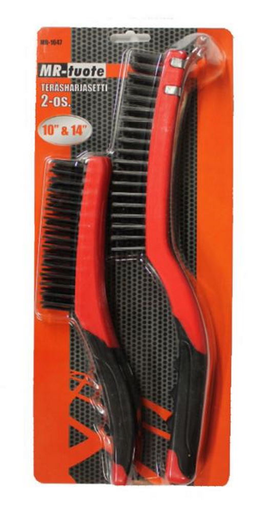 Kestävät teräsharjat 2kpl:een pakkauksessa. Muovirunkoiset teräsharjat. pituus 26 cm ja 34 cm