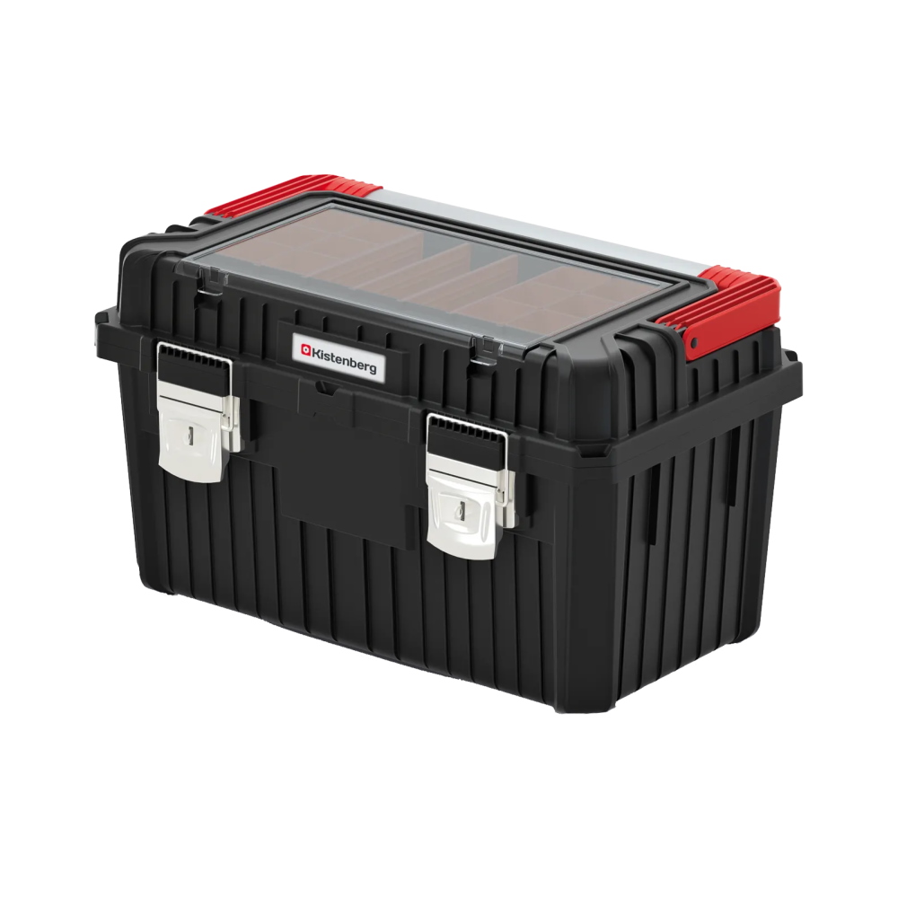 Erittäin vahva työkalupakki alumiinikahvalla ja metallilukoilla. Pölyn- ja vedenkestävä kiinteän tiivisteen ansiosta. Kannessa pientavaralokerot, sisällä kestävä kahvallinen lokerikko.