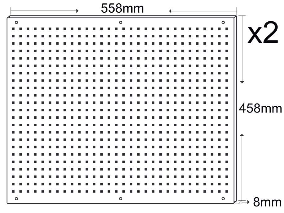 Paketissa 2kpl 558x458mm teräksisiä reikälevy työkaluseiniä.