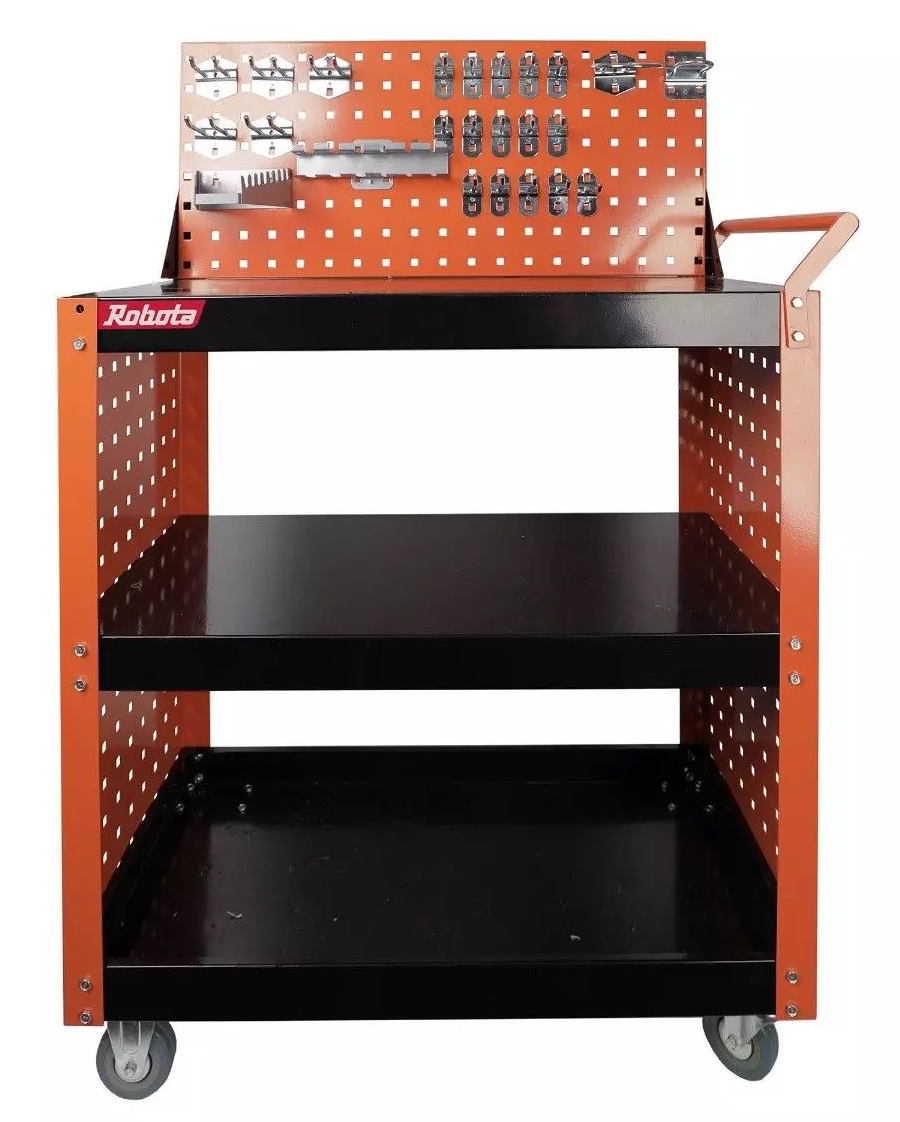 Robotan mallisarjan reilunkokoinen avohyllyinen työkalukärry työkaluseinällä ja reilulla määrällä työkalupiikkejä sekä ripustimia.