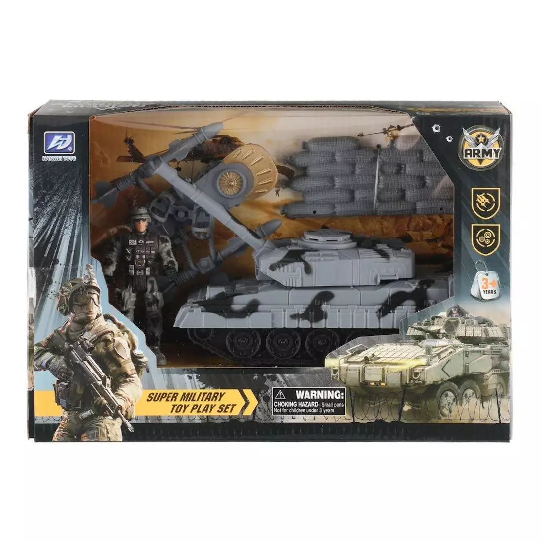 Armeijateemaisessa leikkisetissä lentokone, tankki, hiekkasäkkejä, sotilas.