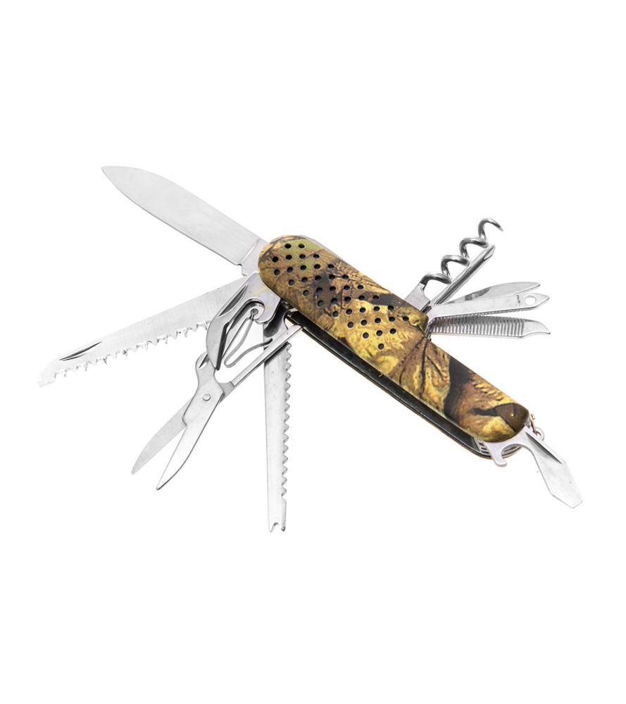 14 eri toimintoa, mm. sakset, saha, viila, veitsi, purkin- ja pullonavaaja. Sis. vyölaukun.