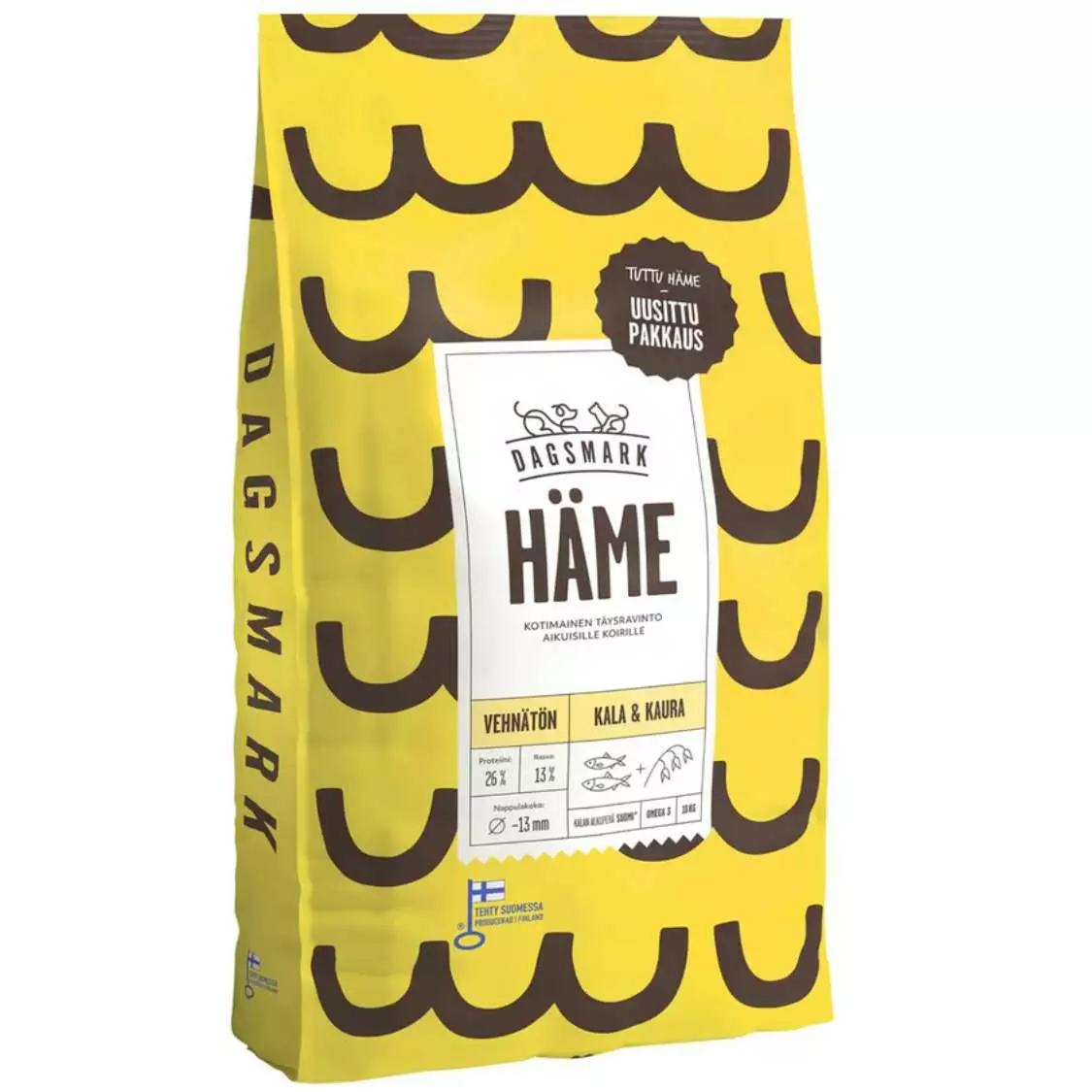 Dagsmark Häme on laadukas ja maukas täysravinto koirallesi. Ruoka sisältää proteiinipitoisia raaka-aineita, kuten kalaa, sekä sulavia hiilihydraatteja perunasta ja kaurasta. Dagsmark Häme ei sisällä vehnää, soijaa eikä säilöntä-, aromi-, eikä väriaineita. Tämän lisäksi ruoka sisältää kaikki tärkeät vitamiinit ja kivennäisaineet, joita koira tarvitsee pysyäkseen terveenä.