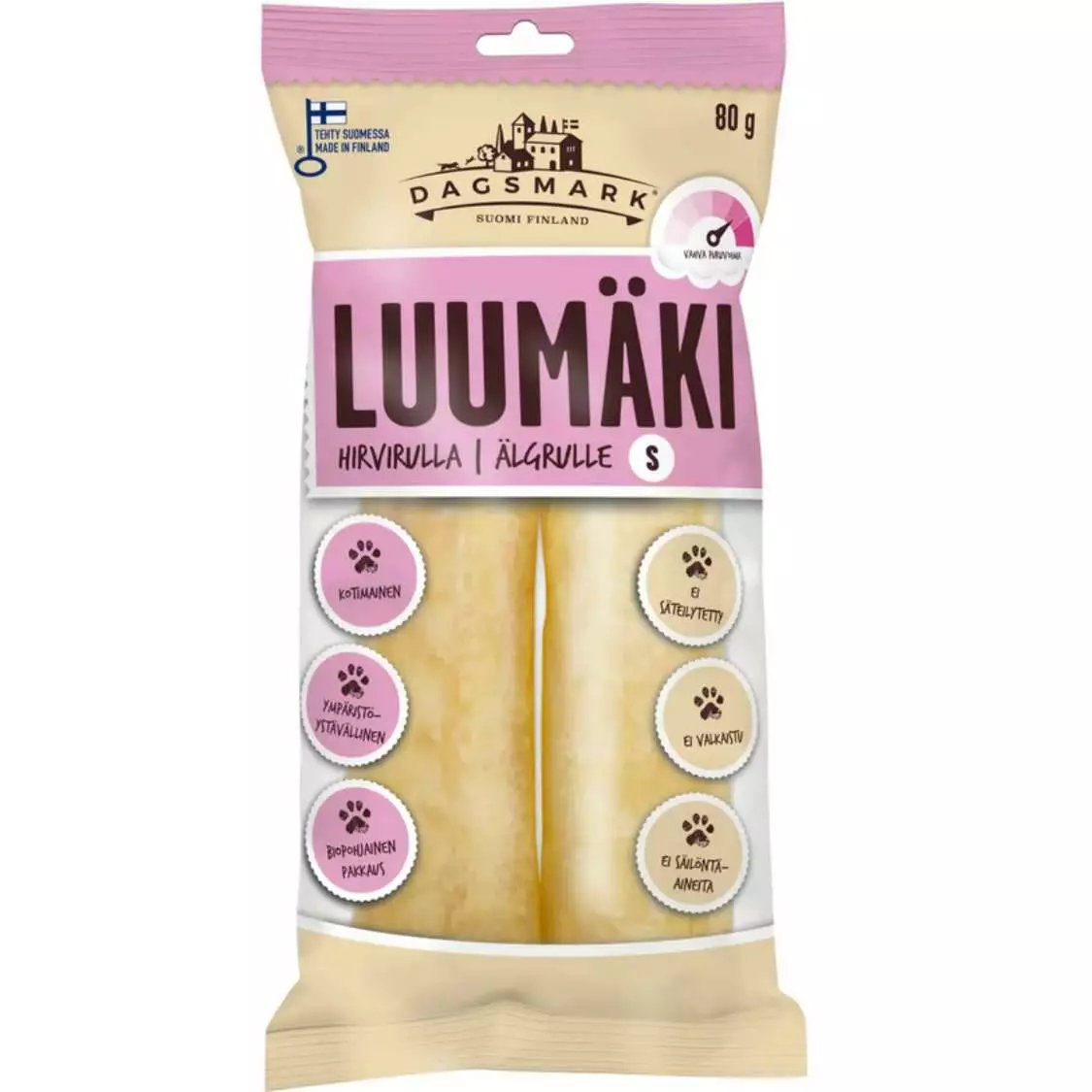 Dagsmark Luumäki S 80 g hirvirulla on kotimainen ja laadukas puruluu koirille. Tämä herkku on valmistettu aidosta hirvennahasta, joka on peräisin Pohjolan luonnosta. Tuotteemme ovat säilöntäaineettomia, lisäaineettomia ja valkaisemattomia. Lisäksi ne eivät ole altistuneet säteilylle.