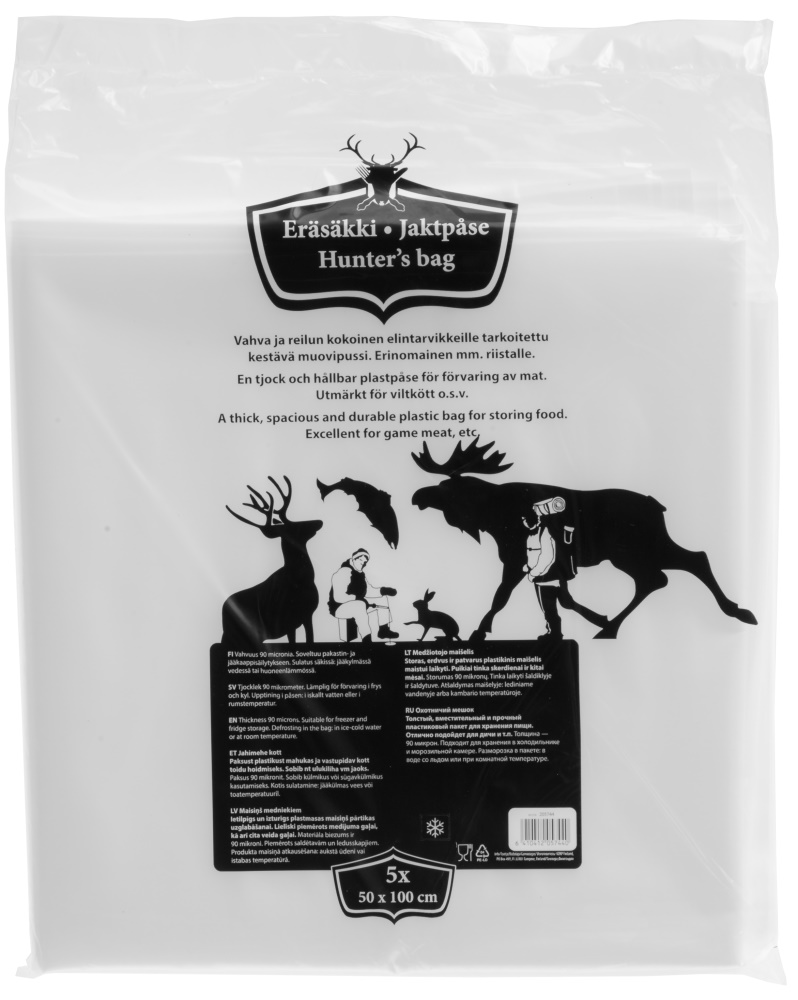 Vahvuus 90 mikronia. -20 -+100 astetta. Reilun kokoinen (50 x 100 cm) ja kestävä muovipussi elintarvikkeiden käsittelyyn, mainio tuote esim. riistalle! Soveltuu pakastin- ja jääkaappisäilytykseen.