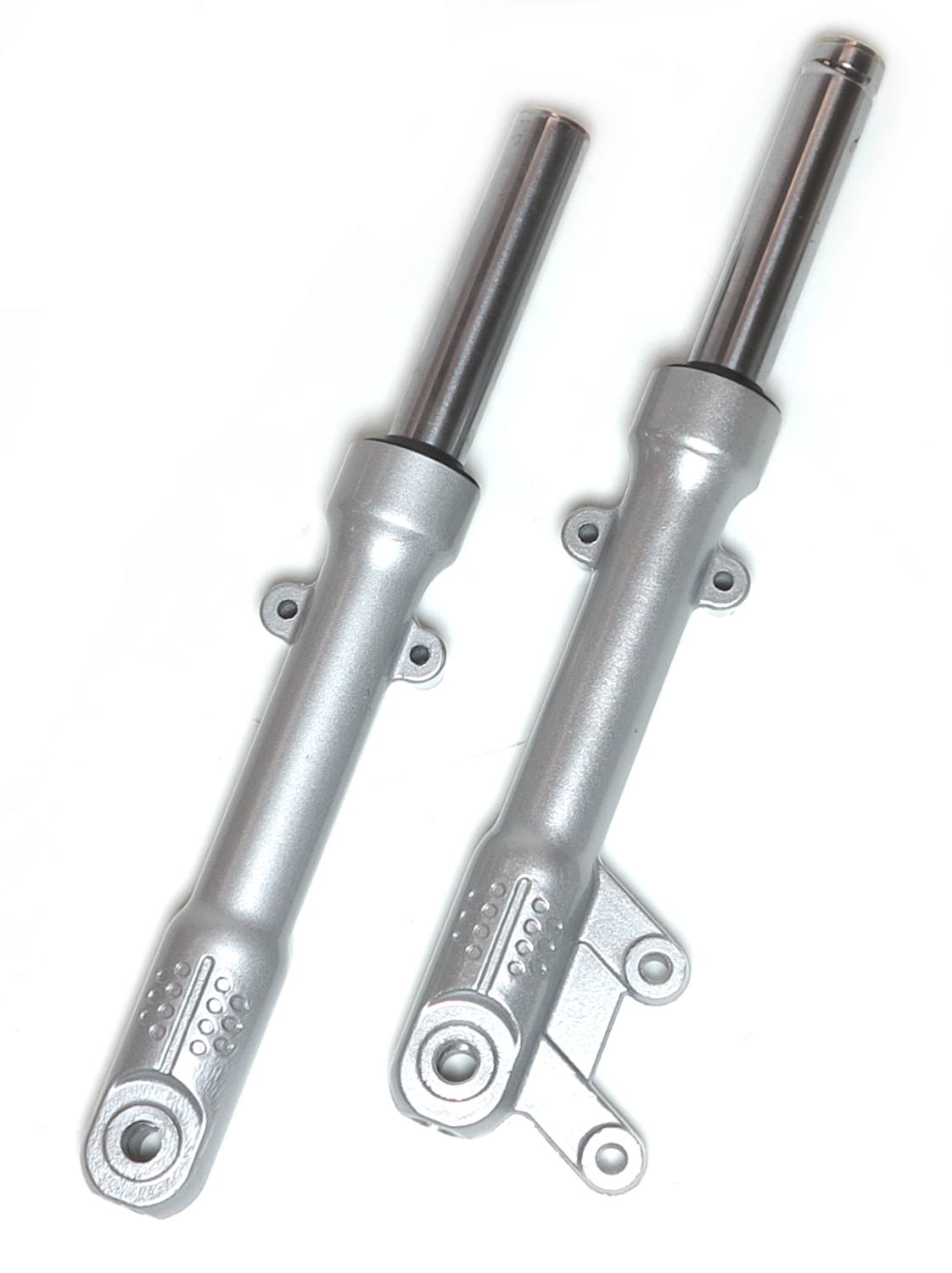 Sähköskootterin etuiskunvaimentimet vasen ja oikea. Iskunvaimentimen kokonaispituus 385mm.