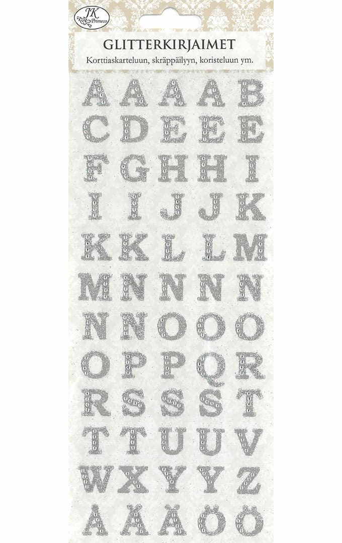 Glitterkirjaintarrat askarteluun, skräppäilyyn ja koristeluun.