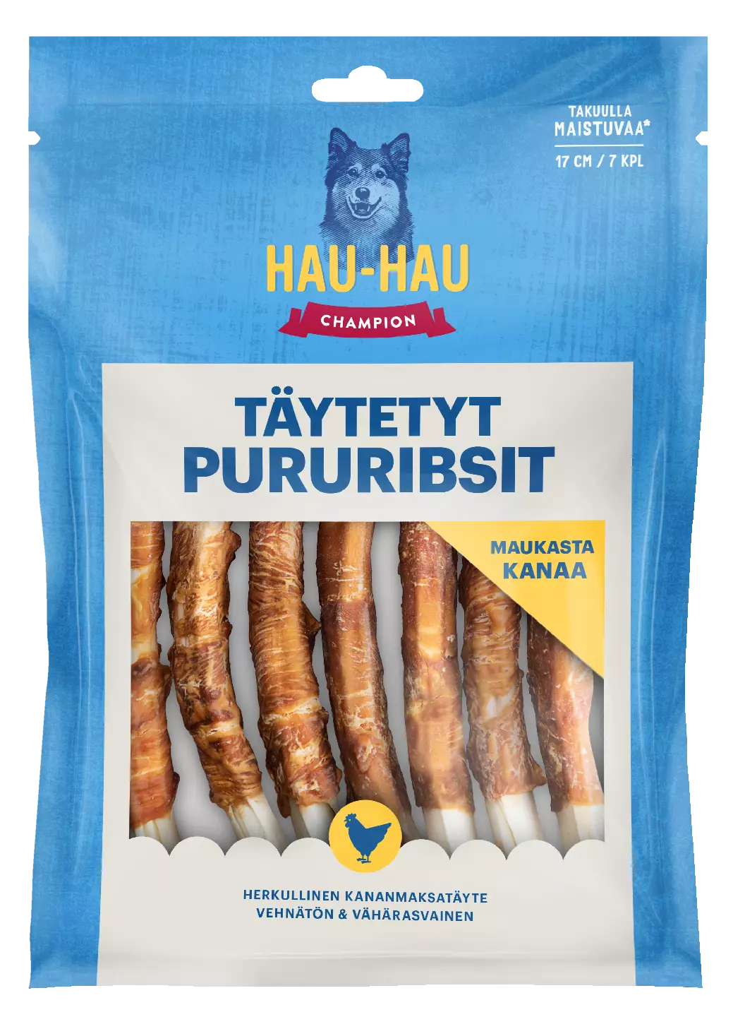 Hau-Hau Championin Täytetyt pururibsit ovat paksuja puruluita, jotka tarjoavat mukavasti työtä koiran hampaille. Vehnättömien puruluiden sisältä löytyy herkullinen kananmaksatäyte. Lisäksi puruluiden päällä on maukasta kanafileetä, joka saa nirsonkin koiran innostumaan.