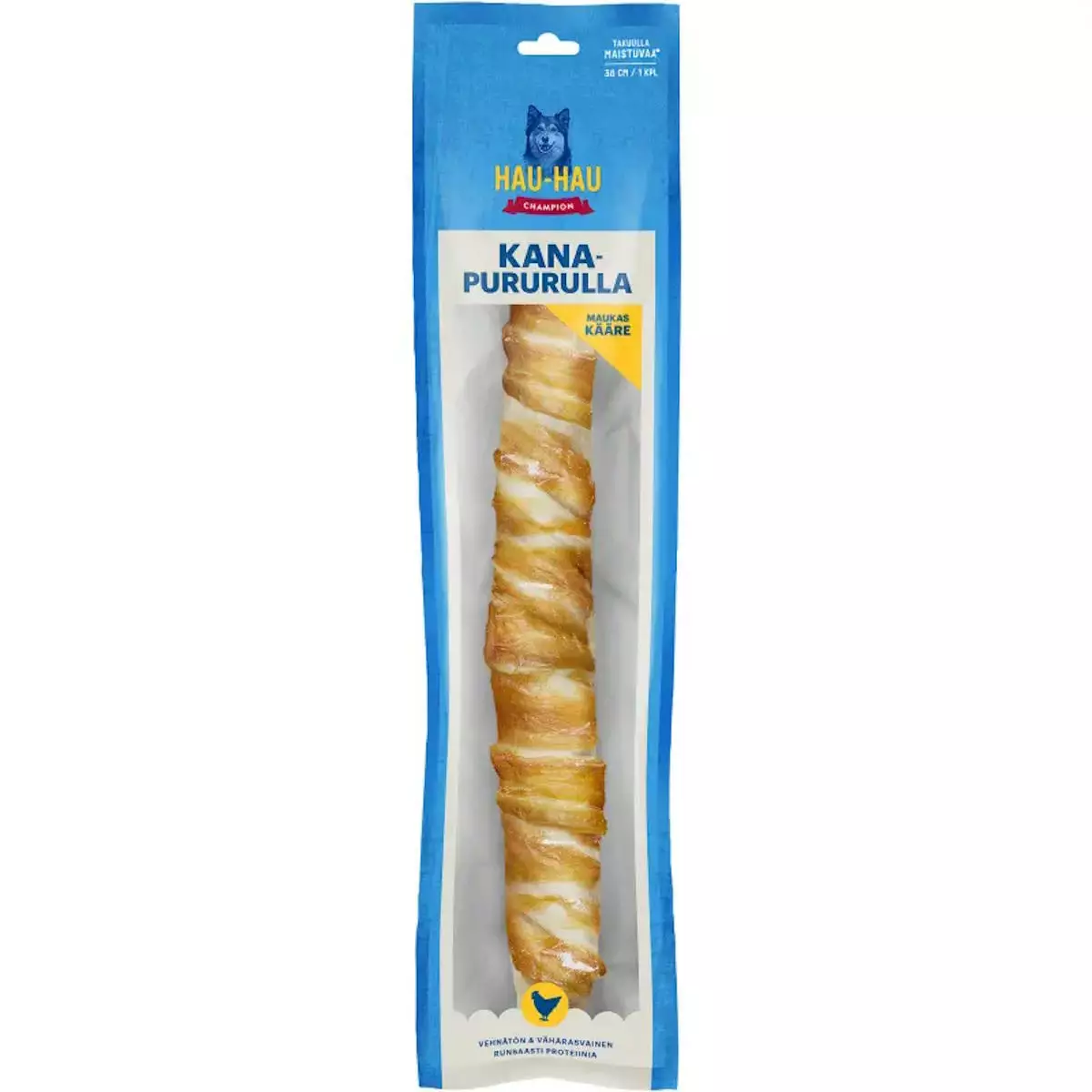 Hau-Hau Champion naudannahkaiset pururullat sopivat erityisen hyvin koiran luonnollisen pureskelutarpeen tyydyttämiseen. Pureskelu lieventää stressiä ja tarjoaa koiralle aktiviteettia. Pururullan pureskelu voi myös raikastaa hengitystä. Pitkä kanapururulla on erittäin vähärasvainen puruluu, jota voi tarjota koiralle ajanvietteeksi ja hampaiden terveyden ylläpitoon. Hau-Hau Champion kanapururulla on päällystetty herkullisella kananlihalla, joten sen maistuu myös nirsoille koirille. Tämä tuote sopii erityisesti suurille koirille.