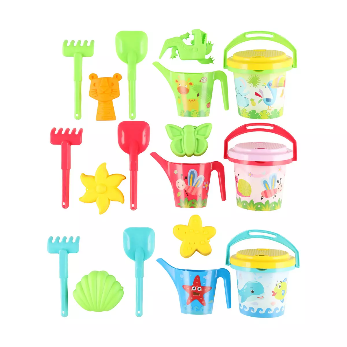 Värikäs hiekkalelusetti tuo iloa hiekkaleikkeihin pihalla, rannalla ja leikkipuistossa. Setissä on mukana kaikki tarvittava hiekkalinnojen ja muotojen rakentamiseen, ja eri välineet sopivat hyvin pieniin käsiin.
