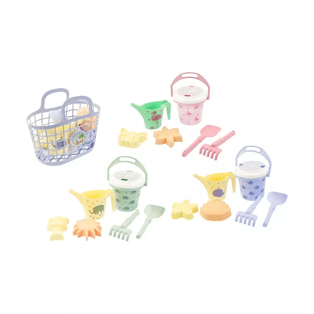 Hiekkalelusetti muovikorissa on helppo ottaa mukaan rannalle, puistoon tai pihaleikkeihin. Kori pitää lelut yhdessä paikassa ja helpottaa kuljettamista. Setin välineillä onnistuvat niin hiekkakakut kuin pienet rakennelmat.
