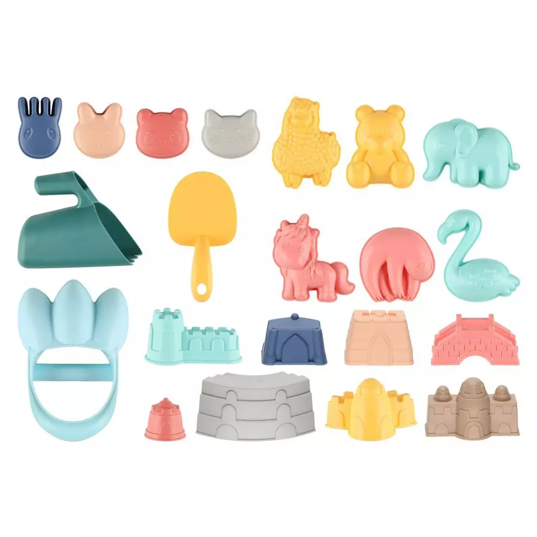 Upeassa hiekkalelusetissä on peräti 20 osaa. Setti sisältää mm. suloisia eläinmuotteja, kuten yksisarvinen, flamingo ja laiskiainen, hiekkalinnamuotteja ja paljon muita ihanuuksia.