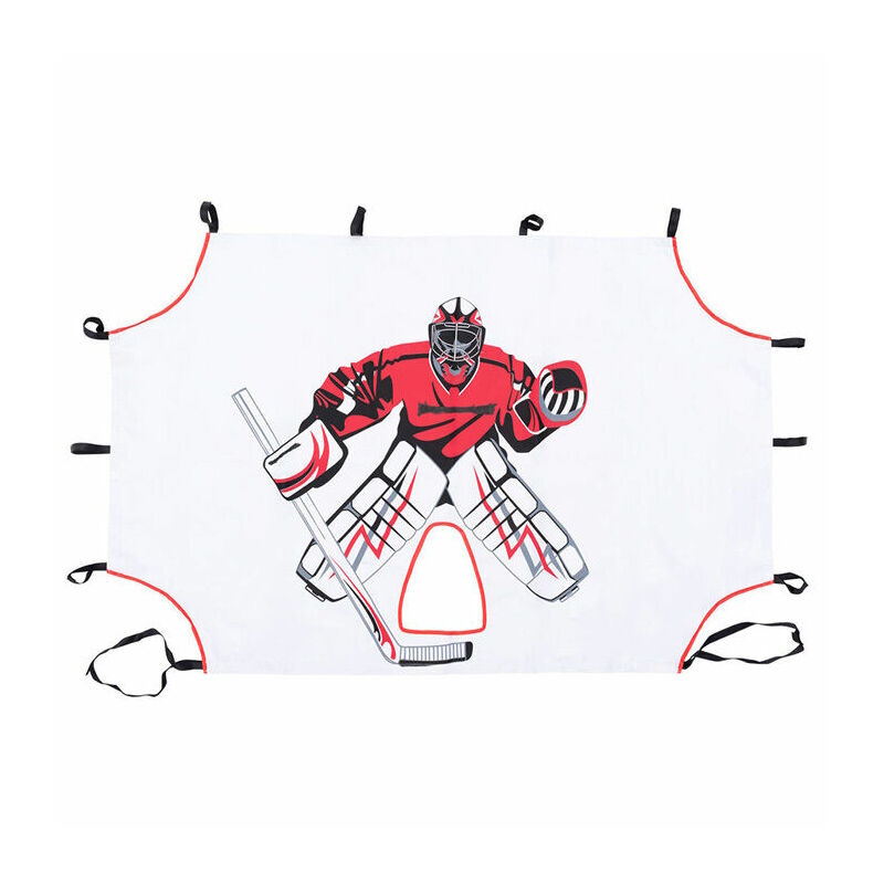 Jääkiekkomaaliin kiinnitettävä kangas mahdollistaa laukaisuharjoittelun myös kotona. Maalivahtikangas, jossa reiät laukaisuharjoituksia varten. Valmistettu vahvasta polyesterista, helppo ja nopea tarranauhakiinnitys.