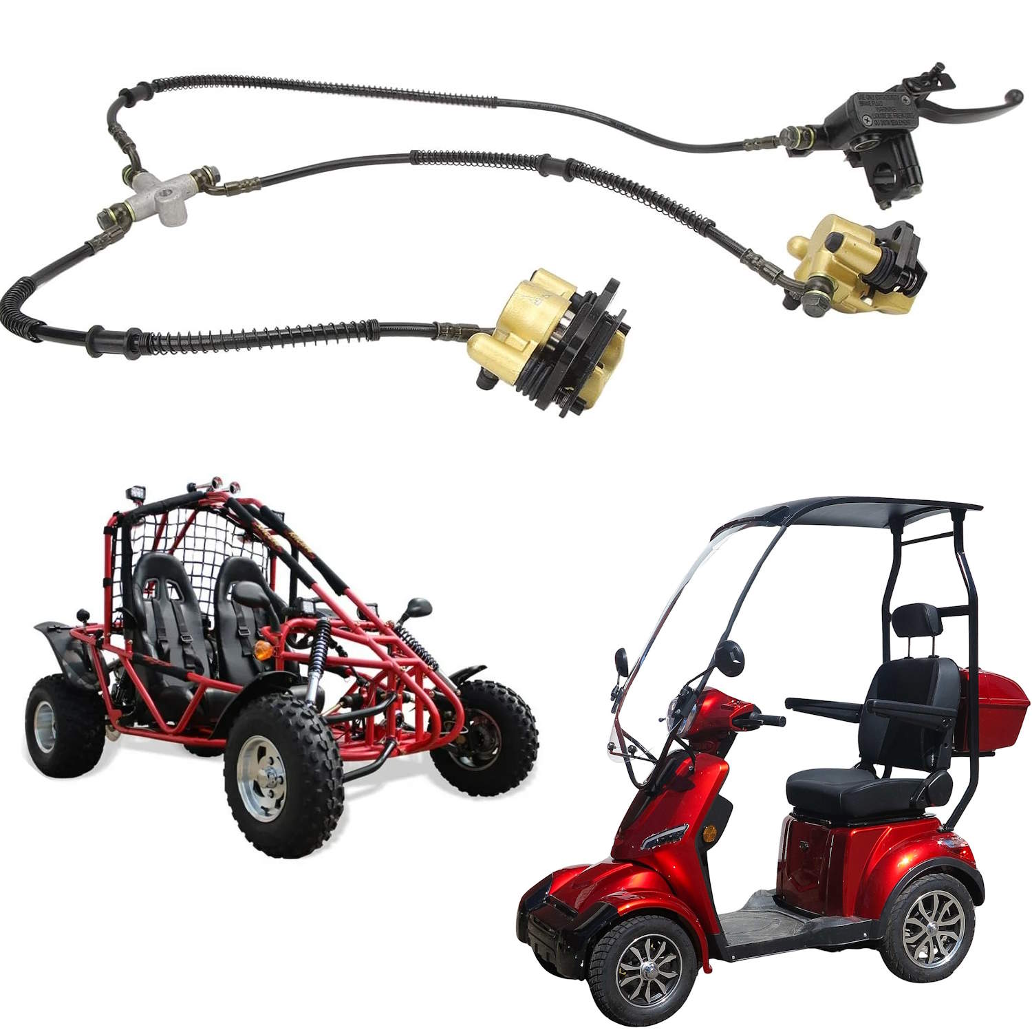Täydellinen etujarrusetti nelipyöräiseen senioriskootteriin. Sopii myös muihin menopeleihin. Lisäksi jarrukahvassa elektroninen jarruvalokatkaisin.