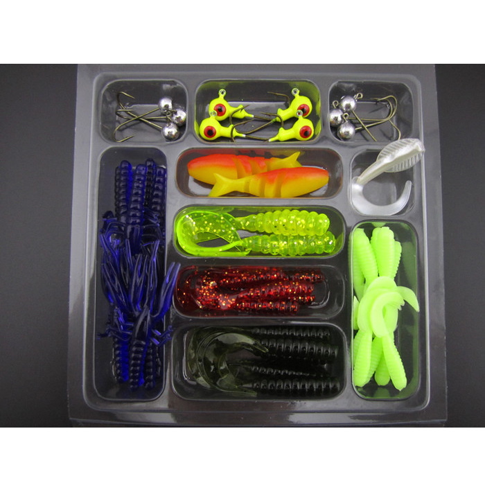 Mahtava jigilajitelma jossa erivärisiä jigejä, koukkuja ja painoja.