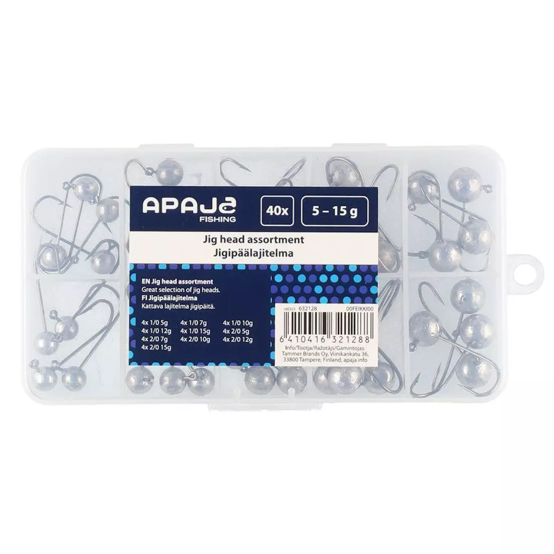 Kattava lajitelma jigipäitä. 4 kpl 1/0 5g, 4 kpl 1/0 7g, 4 kpl 1/0 10g, 4 kpl 1/0 12g, 4 kpl 1/0 15g, 4 kpl 2/0 5g, 4 kpl 2/0 7g, 4 kpl 2/0 10g, 4 kpl 2/0 12g, 4 kpl 2/0 15g.