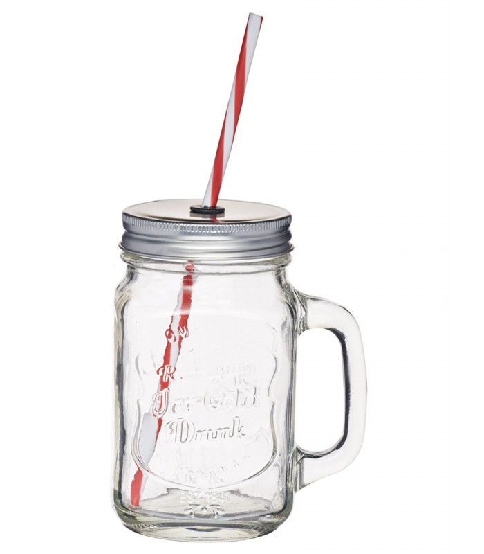 Lasinen juomapurkki kannella ja pillillä. Tilavuus 450ml.