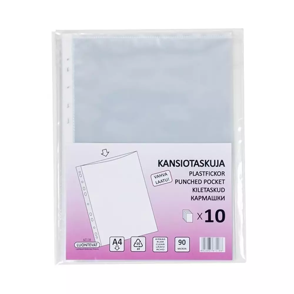 Kirkas ja kestävä kansiotasku A4-asiakirjojen säilytykseen ja suojaamiseen. Vahvasta 90 micronin polypropeenista valmistettu tasku pitää paperit siisteinä ja helposti luettavina. Yläreuna on avoin, joten asiakirjat on helppo sujauttaa taskuun ja ottaa pois. Monirei'itys tekee taskusta yhteensopivan lähes kaikkien mappien ja kansioiden kanssa.