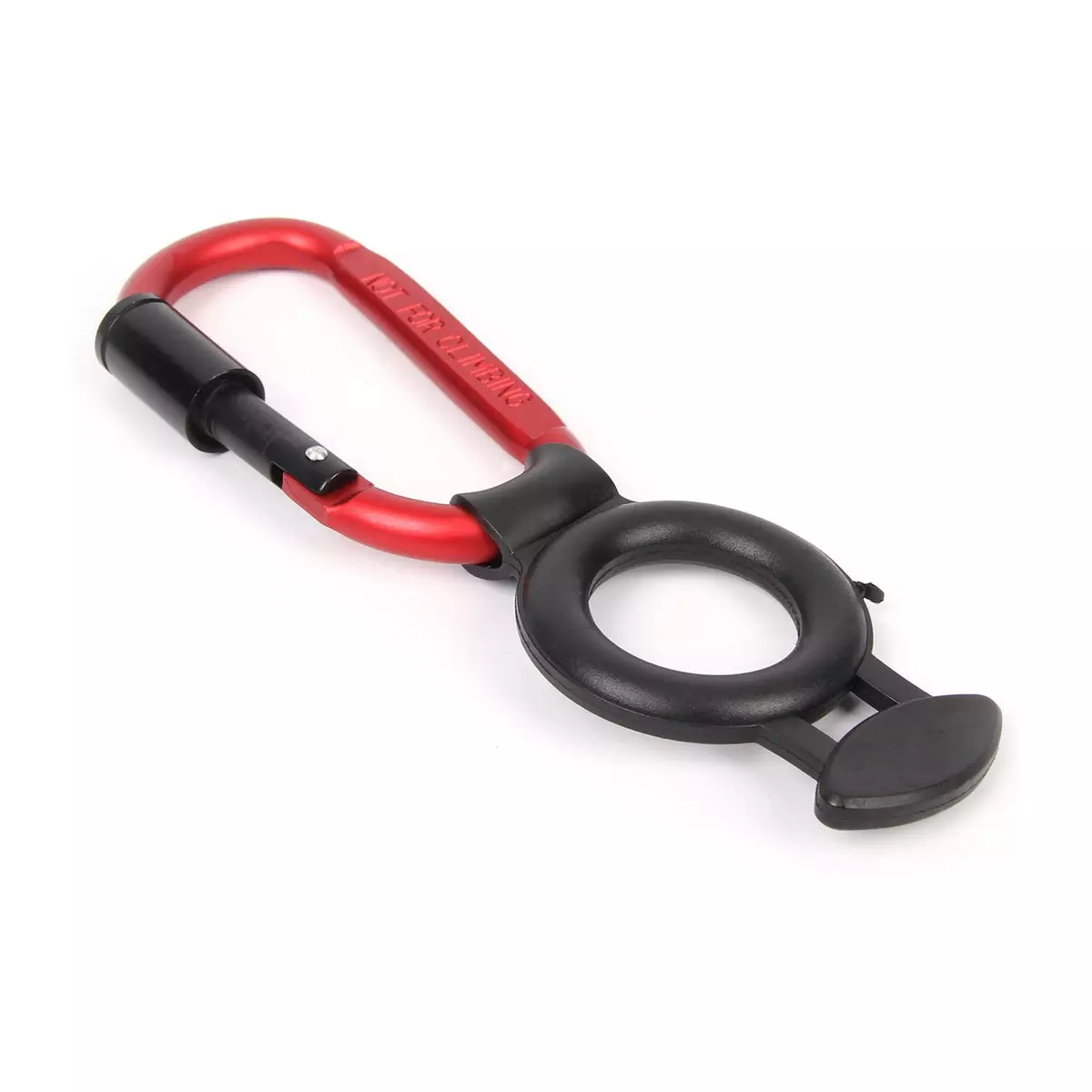 Alumiininen karabiini juomapullon kiinnittämiseen. Kuminen kaulus pitää pullon tukevasti paikallaan ja helpottaa kuljettamista liikkeellä ollessa. Kevyt mutta kestävä 7001 alumiini sopii retkeilyyn ja arjen käyttöön. Kierrelukitus auttaa pitämään karabiinin suljettuna käytön aikana. Sopii yleisimmille juomapulloille, kuten 0,5 l ja 1,5 l pulloille. Karabiini voidaan kiinnittää esimerkiksi vyön lenkkiin tai repun olkahihnaan. Pullo asetetaan kumirenkaan kautta kauluksen yli. Ei sovellu kiipeilyyn.