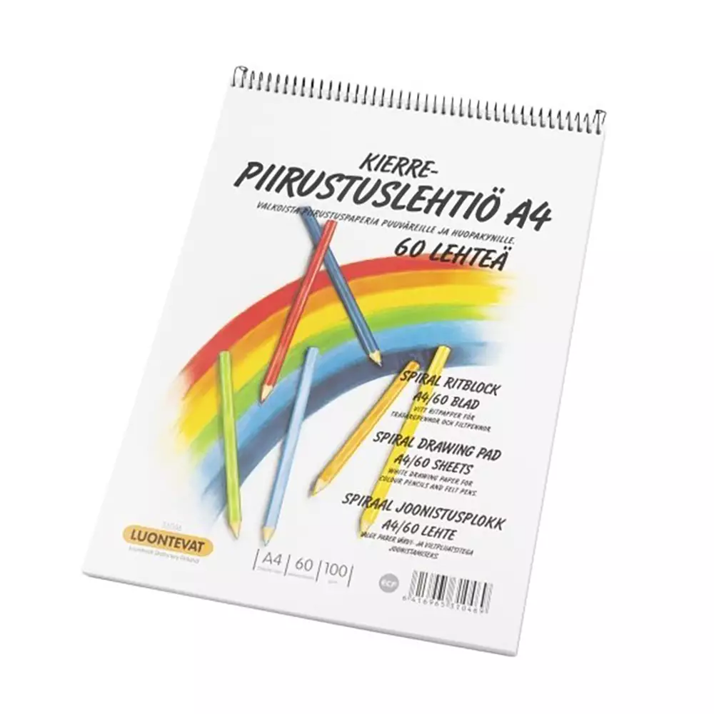 Käytännöllinen A4-kokoinen kierrepiirustuslehtiö soveltuu hyvin piirtämiseen, luonnosteluun ja värittämiseen. Hyvälaatuinen valkoinen piirustuspaperi toimii erinomaisesti puuväreille ja huopakynille.