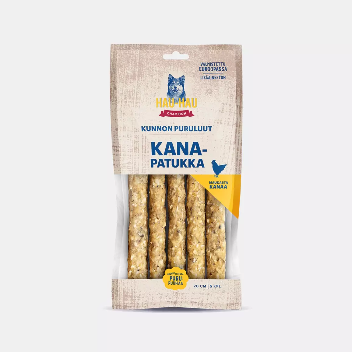 Herkullista pureskeltavaa koiralle. Hau-Hau Championin Kunnon puruluut -sarjan Kanapatukka on isompi maistuva rouhepatukka, joka sopii hyvin myös pienemmälle puruvoimalle. Kanapatukka on saatavilla myös pienille koirille sopivassa koossa. Vähärasvainen ja runsasproteiininen Kanapatukka on täysin viljaton puruluu, joka ei sisällä säilöntäaineita.
